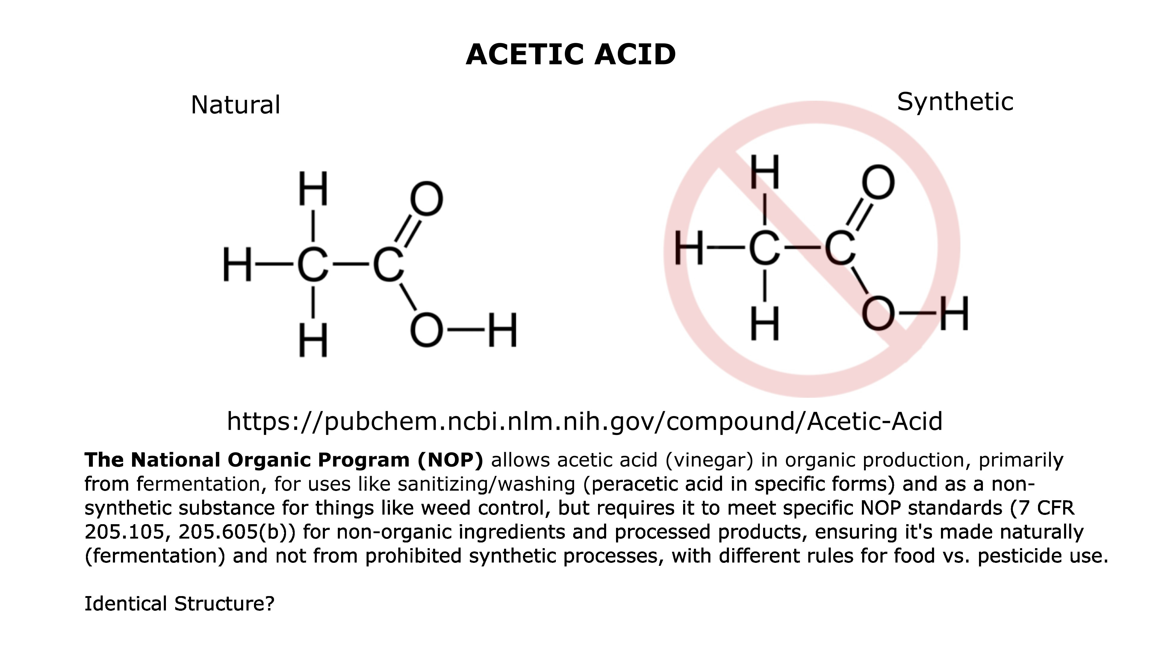 Today appears remarkably similar, and the word ‘natural’ itself continues to be used successfully in marketing.15 Let me add that National Organic Standards persists in treating identical molecules differently. For example, synthetic acetic acid (a 4-8% component of vinegar) is prohibited in some instances, yet any that occurs naturally through fermentation is acceptable.